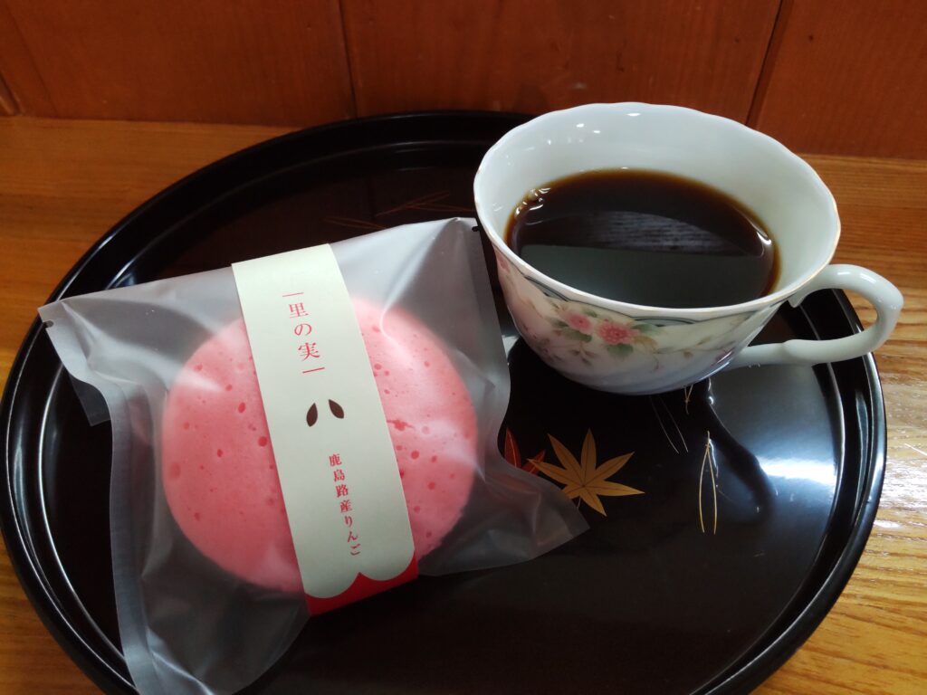 タスカルさんへの質問が飛び交い、賑わう会場でしたが、頃合いを見てカフェタイムへ。今日のお菓子は島出町「佐吉庵」さんの「里の実」です。羽咋鹿島路産のりんごを使ったジャム餡入り!やさしいピンクのまぁるいサンド。ふわふわでおいしかったです♡