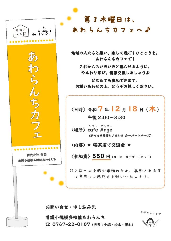 次回は、12月18日(木)の予定です。年内最後は喫茶店へお出かけ。今年も「cafe Ange」さんで楽しい交流会をしましょう♪ ぜひ、ご参加ください。