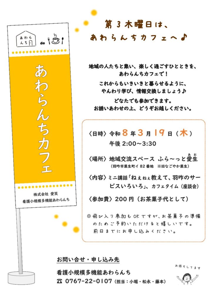 次回は、3月19日(木)の予定です。羽咋にあるいろいろなサービスをご存知ですか?あわらんちカフェで教えてもらいましょう!どうぞご参加ください。