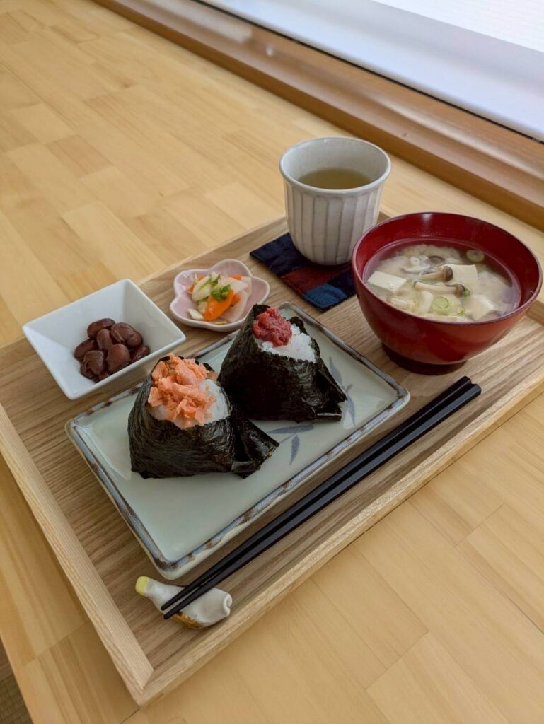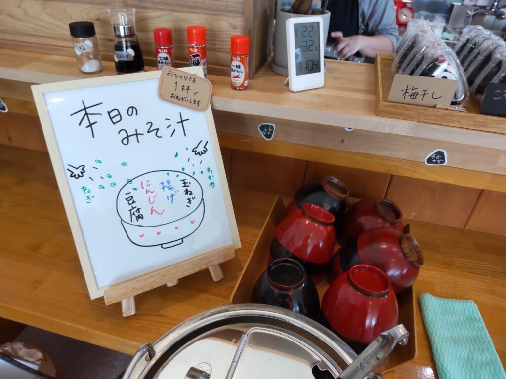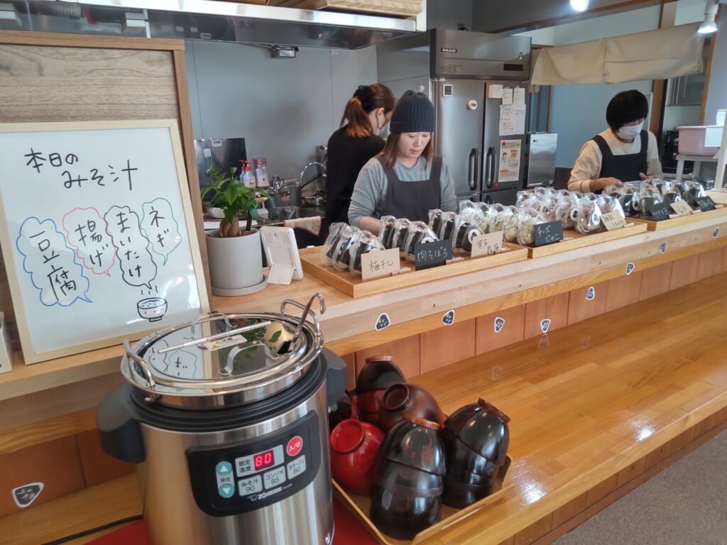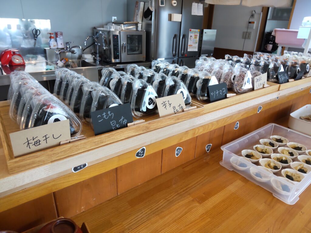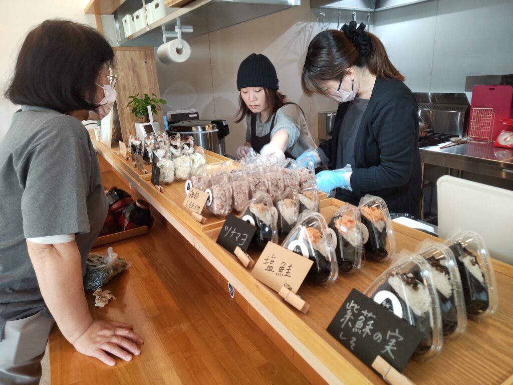 た~くさん並べたおむすびとともに、お客さまをお迎えしました。お時間がある方にはその場でおむすびを握りますヨ♪ ふわっと握りたて、あたたかいおむすびをどうぞ~♡ おむすびセットにすれば漬物、小鉢、味噌汁が付きます。